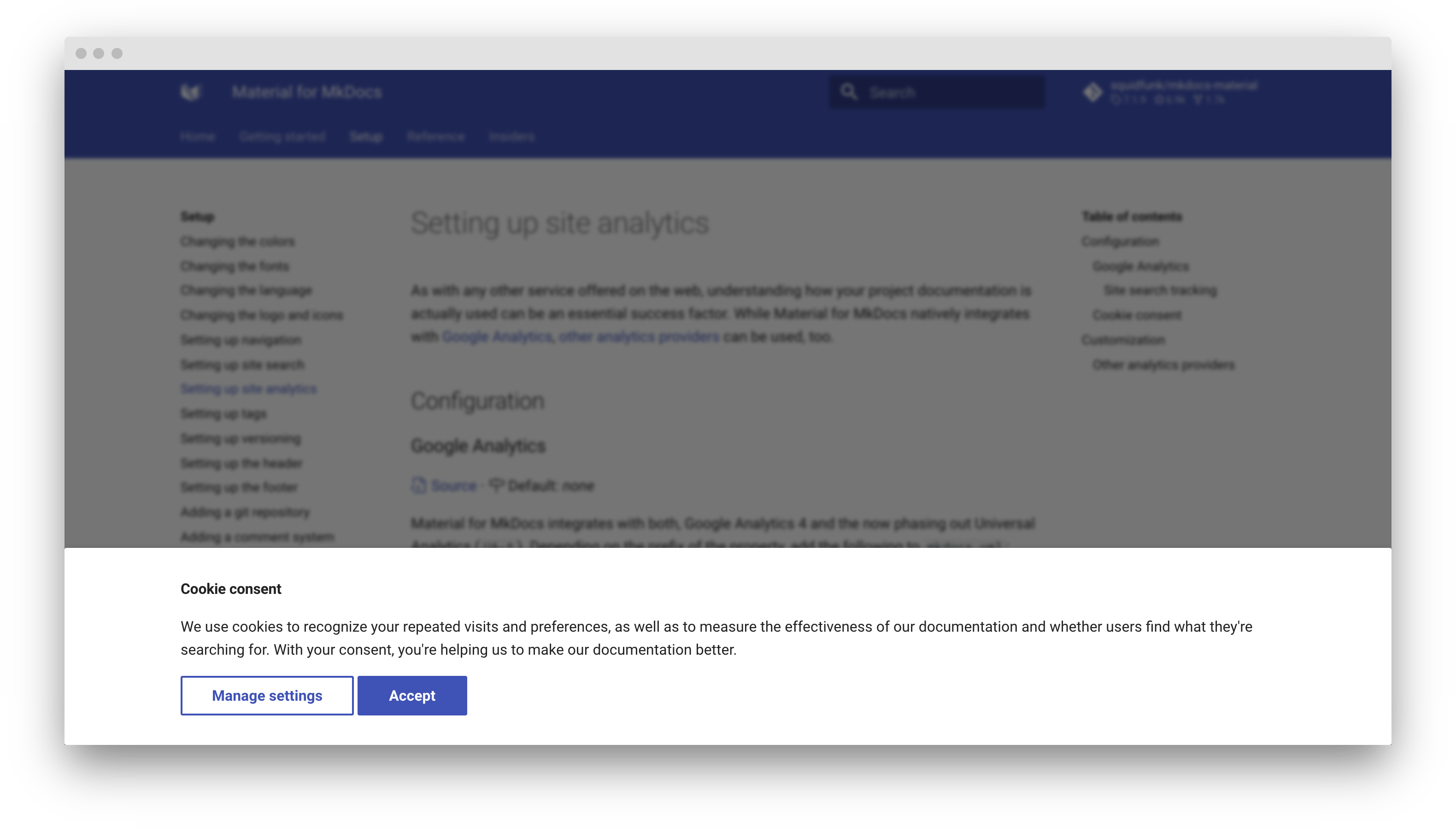 Material for MkDocs makes compliance with data privacy regulations very easy, as it offers a native cookie consent solution to seek explicit consent from users before setting up analytics. Additionally, external assets can be automatically downloaded for self-hosting.